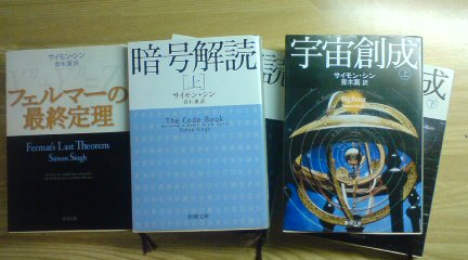 いや、今となっては貴重なケニー・ロバーツとフレディ・スペンサーのバトルが見られて良かったですよ(汗) で、何本かのビデオをダウンロードしたところで気づきました。 このデッキ、3倍速で録画したテープは再生できない(3倍速モードを持っていない)・・・。 それに、音声の切り替え(日本語⇔英語の切り替え)はリモコンが無いからできない・・・ 3倍速の方はあきらめる(しょせん3倍速でもいい画像しか入っていない)として、音声はどうしよう。吹き替えと英語がいっぺんに聞こえてきちゃうんだな、これが。 ヤフオクでリモコンだけ探すか、汎用のリモコンを買うしかないかな。まぁ、そのうちに何とかしましょう。 PR 非常に面白い。 フェルマーの最終定理、暗号解読、宇宙創成。日本で翻訳されているものをここ1ヶ月で一気に読んじまった。 インド人の作家だが、物理及び数学に非常に造詣が深く、読み応え十分。 難解な議論を、歴史に沿って、分かりやすく解説している。そして、ドラマチックである。 一度読んでみたらいかが? ↓本店もいろいろ更新。目次下の更新履歴よりお入り下さい↓ ↓↓↓ 「艨艟ノ棲処」 雨が降りそうな天気だったので、終日引きこもり(笑)。